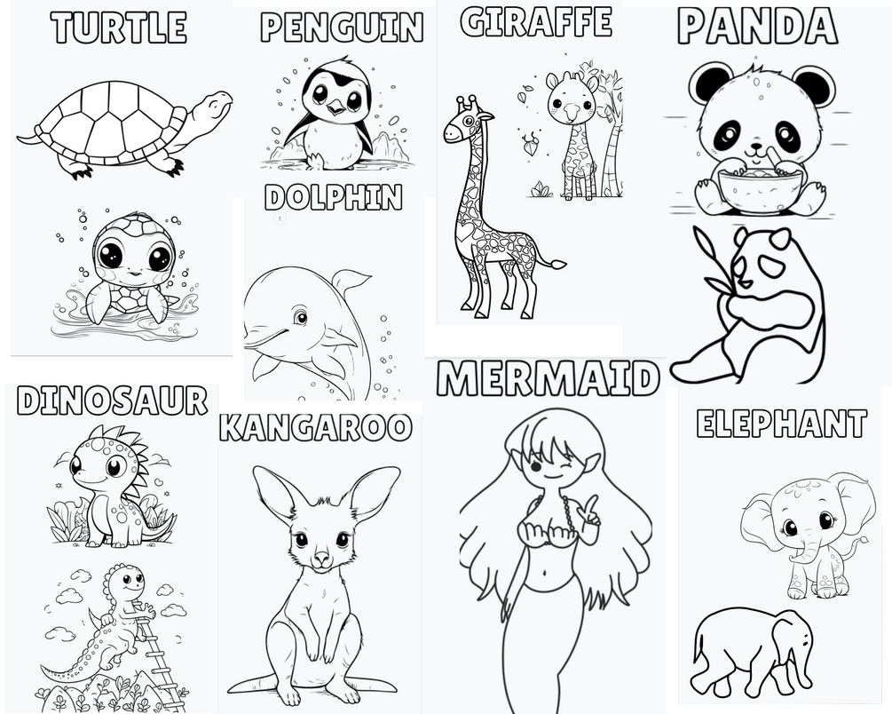 ✔ 50 cute, hand-drawn animals (each on its own page)