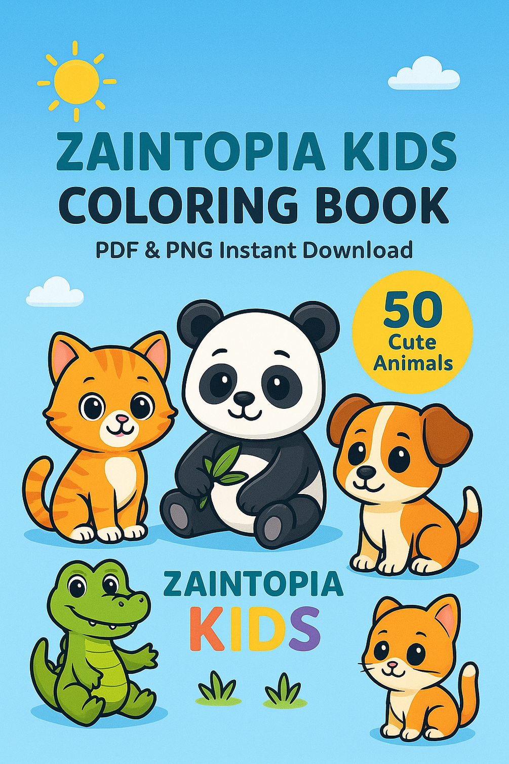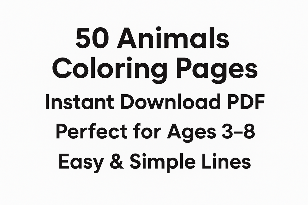 “50 adorable animals to color! Fun, educational, and printable coloring book for kids aged 3–8. Perfect for home, school, or creative activities. Instant download – start coloring today!”